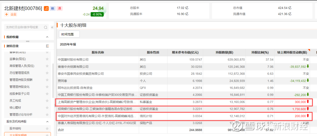 北新建材近日发布年报显示,截至2025年末,高毅资产基金经理邓晓峰管理的两只产品合计持有该公司超2500万股,相较于去年三季度末进一步加仓。值得注意的是,去年三季度,邓晓峰管理的两只产品新进北新建材前十大流通股东名单,足见其对该公司的乐观预期。