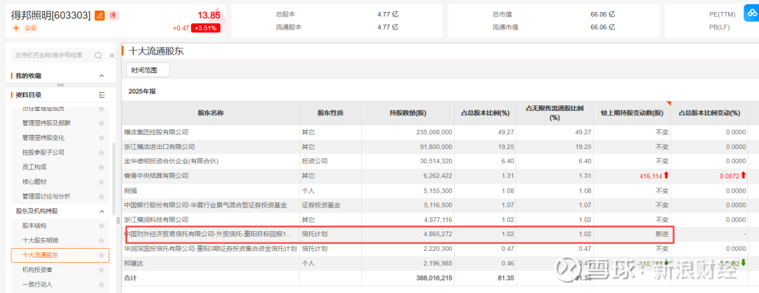 得邦照明近日发布年报显示,截至2025年末,外贸信托-重阳目标回报1期证券投资集合资金信托计划新进该公司前十大流通股东名单,期末持股数量为486.53万股。