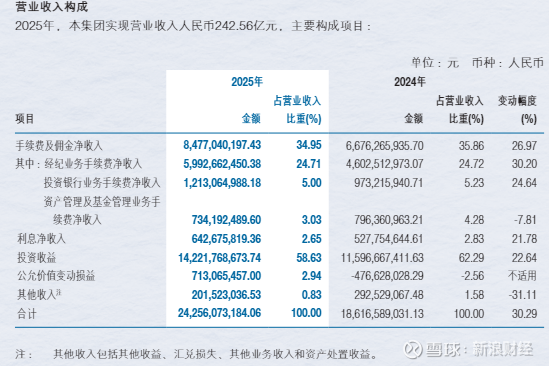 从收入构成来看,2025年公司“投资收益+公允价值变动损益”合计为149.35亿元,占营业收入的比重达61.57%,较上年同期的59.73%进一步提升。而手续费及佣金净收入为84.77亿元,占比从35.86%降至34.95%。