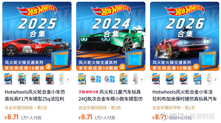 天猫风火轮旗舰店部分在售产品,单价不足10元风火轮品牌创始于1968年,最初是希望与火柴盒等品牌竞争,打造比市面上其他产品更快、更刺激的玩具车。相比很多别的玩具车,风火轮是真的“可以玩”,能够在赛道上飞驰,做出各种惊险特技,为孩子们带来无穷的乐趣和想象力发挥。