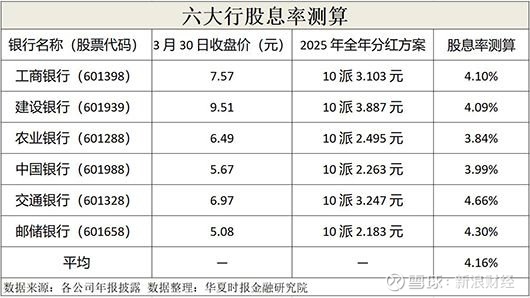 以2026年3月30日A股收盘价为基准测算,六大行股息率处于3.8%至4.7%区间。