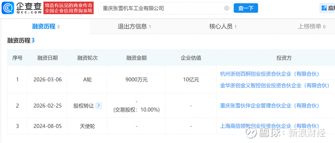 据张雪机车公开披露信息显示,今年3月初,张雪机车完成A轮融资,该轮融资实际到位资金9000万元,公司投后估值约10.9亿元。