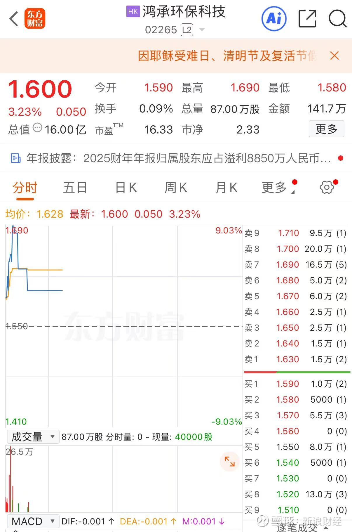 消息面上,鸿承环保科技日前发布2025年全年业绩报告,公司实现总收入3.24亿元,同比增长38.36%;净利润8850万元,同比增长47.47%;毛利率从去年同期的56.3%提升至60.0%。