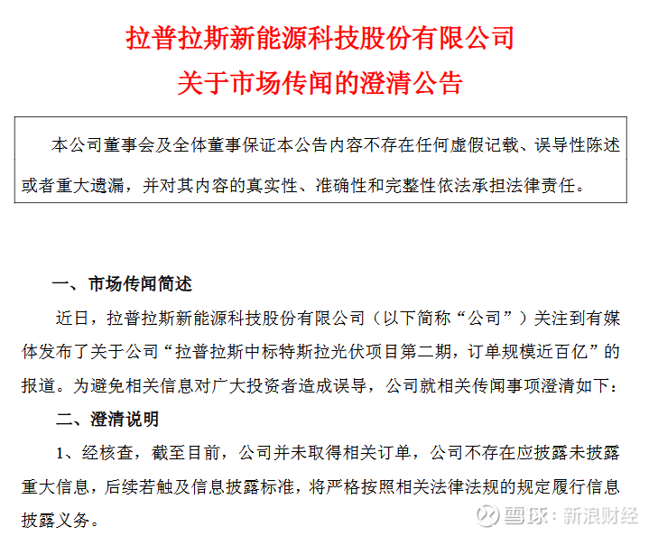 4月1日午间,因“中标特斯拉光伏项目第二期”相关市场传闻而盘中股价涨停的拉普拉斯,紧急发布澄清公告称,截至目前,公司并未取得相关订单。