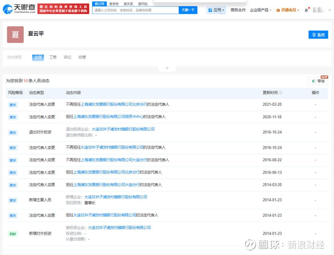 夏云平同样来自浦发银行体系,天眼查显示,2014年1月夏云平在大连甘井子浦发村镇银行担任法定代表人、董事长,3月担任上海浦东发展银行大连分行法定代表人,2016年6月调任浦发银行北京分行法定代表人,2020年11月转任浦发银行信用卡中心法定代表人,2024年任浦发银行零售信贷部总经理。