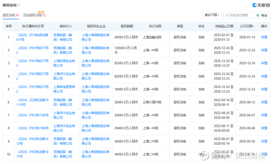 此外,览海系与上海人寿之间股权冻结频现。据天眼查显示,当前共有16条股权冻结记录。