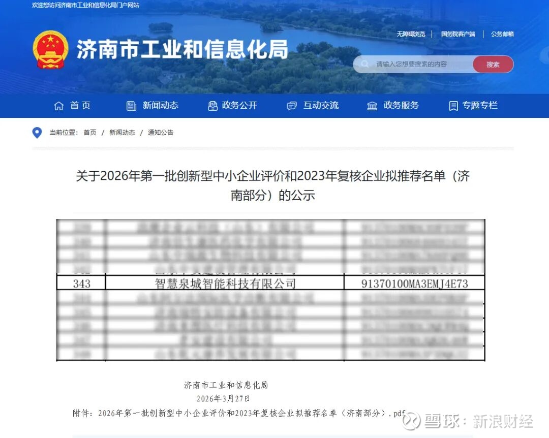 近日,济南市工业和信息化局公示2026年第一批创新型中小企业评价和2023年复核企业拟推荐名单(济南部分),浪潮智慧城市旗下智慧泉城智能科技有限公司凭借突出的创新能力和综合实力成功入选。