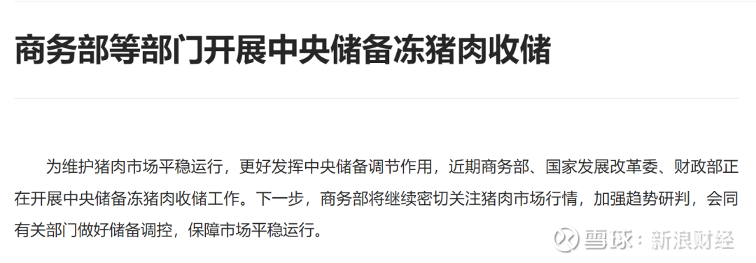 据商务部官网昨日消息,为维护猪肉市场平稳运行,更好发挥中央储备调节作用,近期商务部、国家发展改革委、财政部正在开展中央储备冻猪肉收储工作。下一步,商务部将继续密切关注猪肉市场行情,加强趋势研判,会同有关部门做好储备调控,保障市场平稳运行。