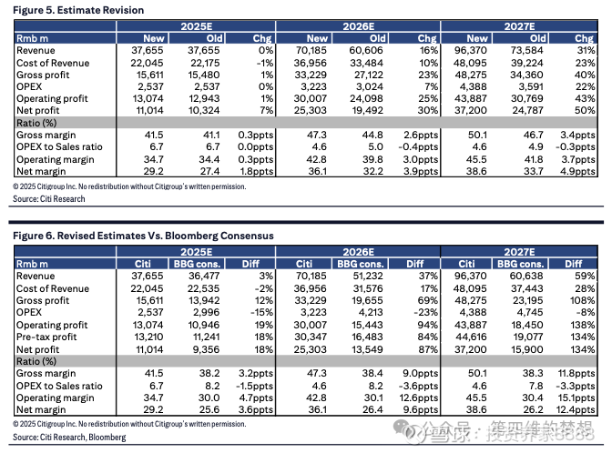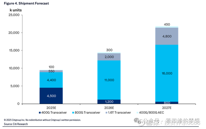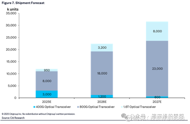 我们维持对 FY26 行业出货量的预测基本不变,但将 FY27 行业需求预测从 800G/1.6T 的 4,950 万/1,800 万只上调至 5,630 万/1,920 万只,对应 同比增长 42%。这一调整反映了以下因素: