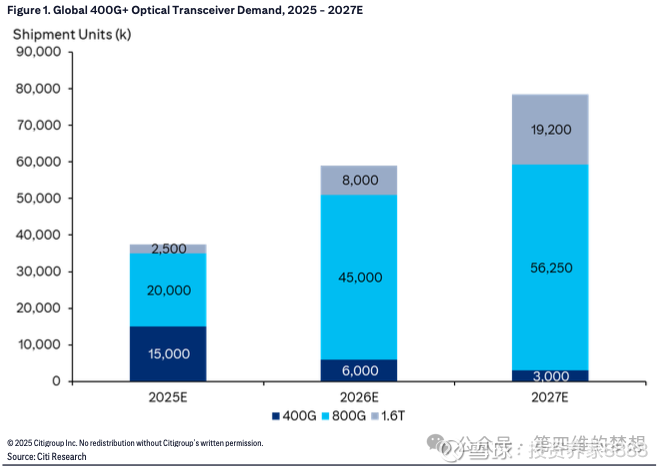 800G 光引擎出货量在 2025–2027 年分别为 40 万/50 万/80 万只(此前预测为 30 万/60 万/60 万只);