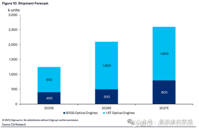我们现在预计 1.6T 光引擎出货量在 2025–2027 年分别为 85 万/160 万/180 万只(此前预测为 80 万/120 万/130 万只);