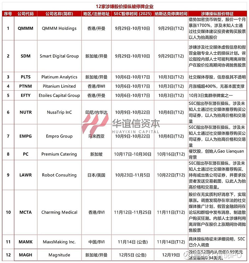SEC已建立成熟的股价操纵稽查技术与流程体系,这些被停牌的12家公司存在显著共性:上市时间普遍较短,多为2024年底至2025年间挂牌,且上市后不久即曝出违规问题,背后更牵涉借壳上市、财报粉饰、配合坐庄等资本市场乱象。