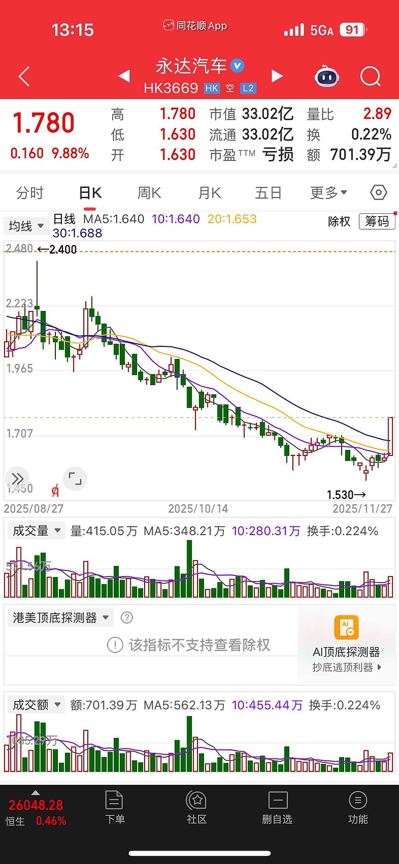 最近永达汽车股价又跌破了1.6港元,较历史高点下跌超90%。当前市净率(PB)最低0.28倍,显著低于汽车经销商板块平均14倍的市盈率水平,反映市场对其基本面的过度悲观预期。