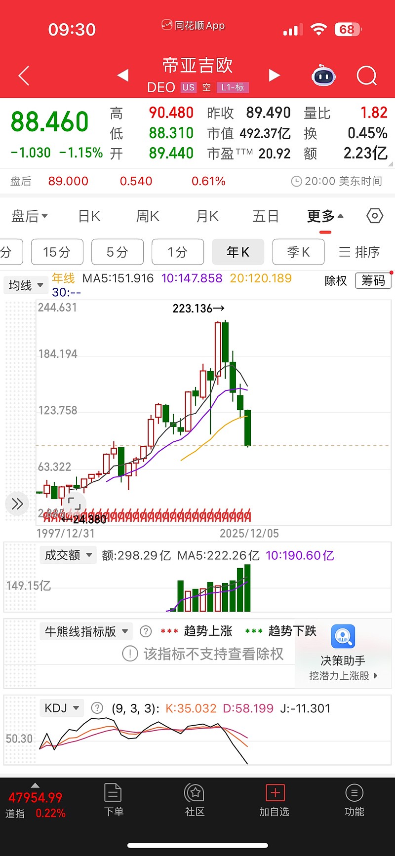 帝亚吉欧(Diageo)作为全球烈酒行业的标杆,旗下拥有尊尼获加、斯米诺等标志性品牌。然而,在美国股市整体大牛市背景下,帝亚吉欧股价却逆势连跌四年,累计跌幅约60%。其核心原因包括: