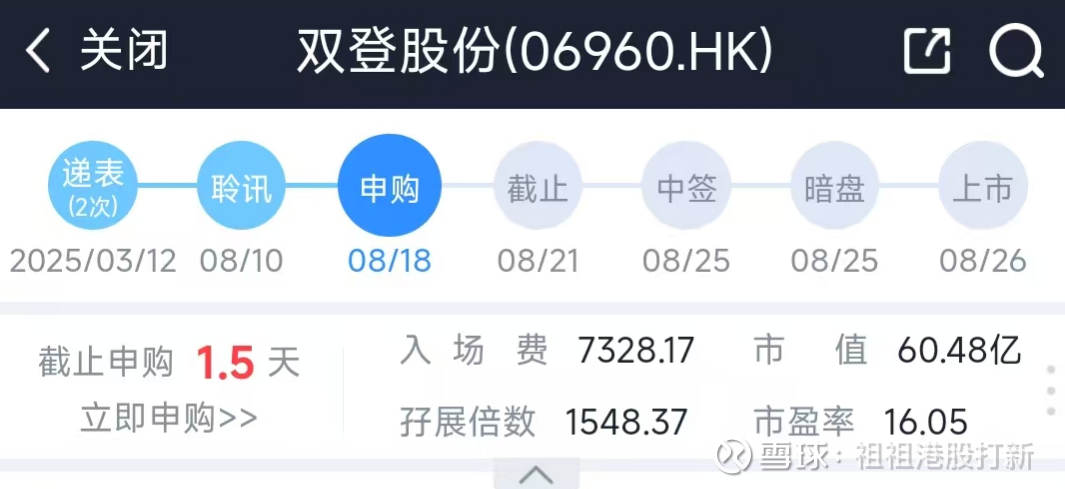 【本来是接着奏乐,接着舞。但8月新规后,选择10%公开发行的,都是梭了也中不了】08.18日周一就已开始招股的双登股份-06960,招股价14.51港元,每手500股,入场费7328元港币,PE16;现在我写文章时已2300倍,我预测最终3500-4000倍吧!直接上结论:继续推荐大家拿命上(偶应all in)港股打新双登。