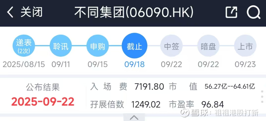 【本来是接着奏乐,接着舞。但8月新规后,选择10%公开发行的,无脑上也难中签了】09.15日周一就已开始招股的不同集团-06090,招股价62.01-71.20港元,每手100股,入场费7192元港币,PE(静)97;现在我写文章时已1300倍,我预测最终2200倍吧!直接上结论:继续推荐大家拿命上(偶应all in)港股打新不同。