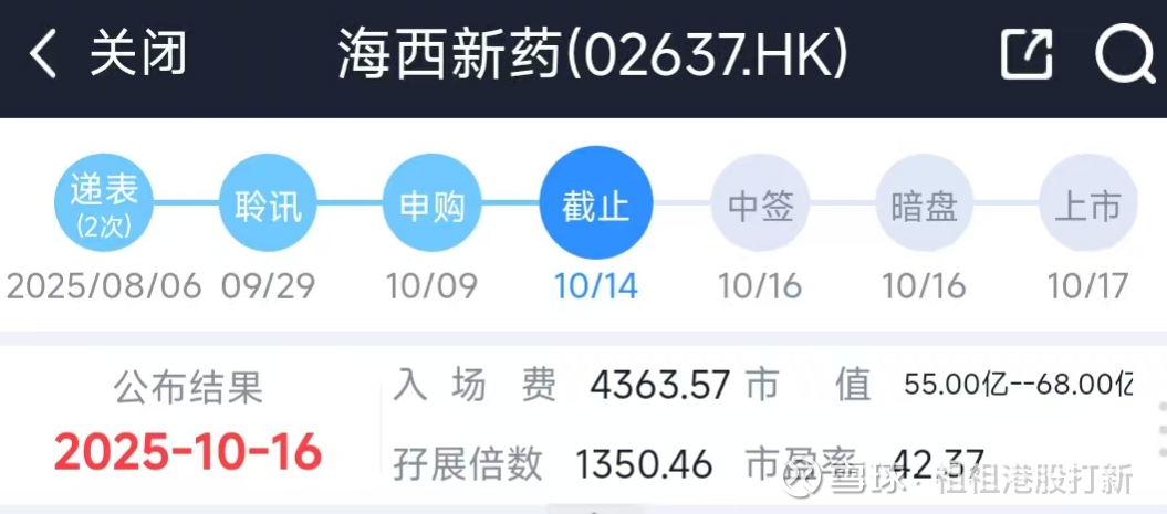 【本来是接着奏乐,接着舞。但8月新规后,选择10%公开发行的,梭了也中不了】10.09日上周四就已开始招股的海西新药-02637,招股价69.88-86.40港元,每手50股,入场费4364元港币,PE42;现在我写文章时已1400倍,我预测最终2500倍吧!直接上结论:继续推荐大家拿命上(偶应all in)港股打新海西。