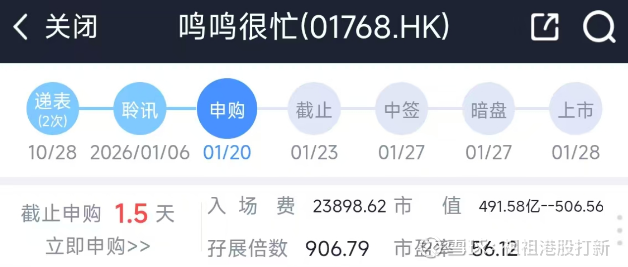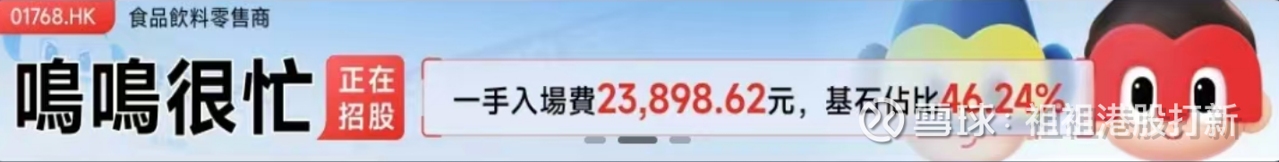 【本来是接着奏乐,接着舞。但8月新规后,中签率非常低,梭了也难中到】01.20日周二就已开始招股的鸣鸣很忙-01768,招股价229.60-236.60港元,每手100股,入场费23899元港币,现在我写文章时已1300倍,预测最终2300倍吧!直接上结论:继续推荐大家拿命上(偶应all in)港股打新鸣鸣很忙。
