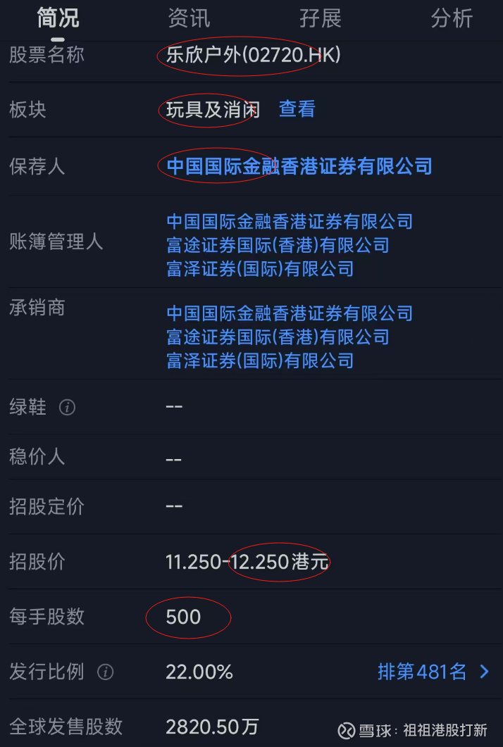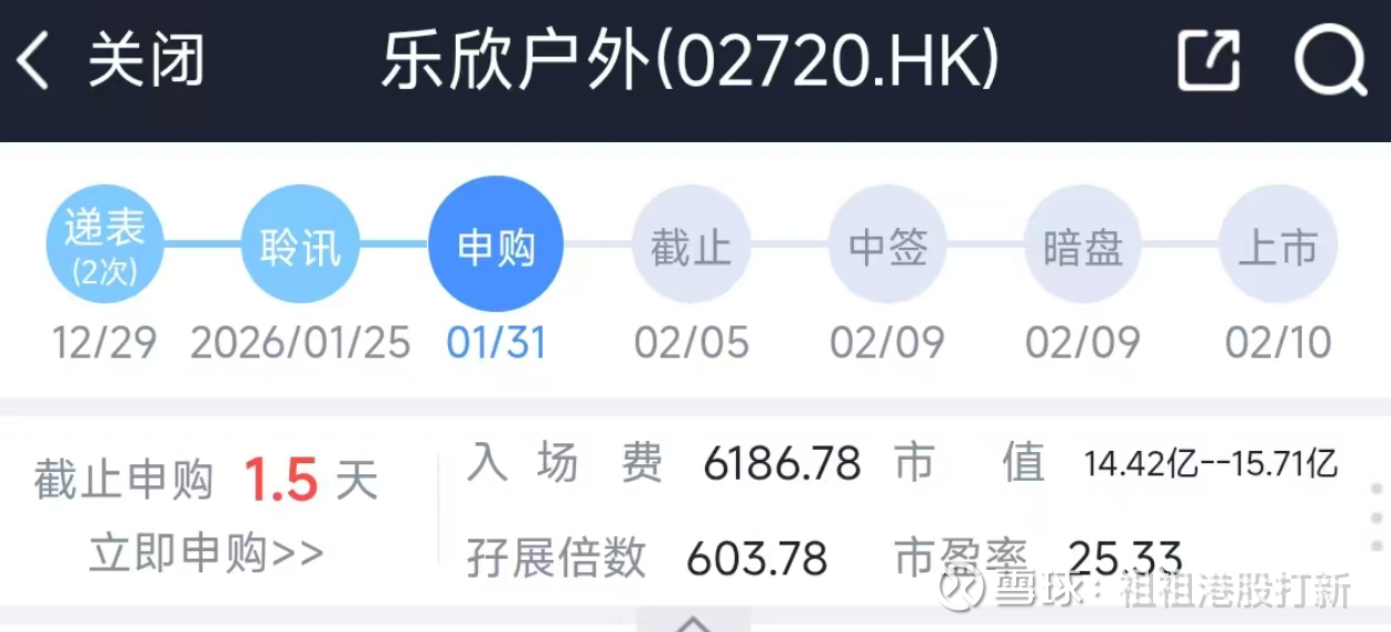 【本来是接着奏乐,接着舞。但8月新规后,中签率狠低,梭了也难中到】01.31日上周六就已开始招股的乐欣户外-02720,招股价11.25-12.25港元,每手500股,入场费6187元港币,现在我写文章时已650倍,预测最终1500倍吧!直接上结论:继续推荐大家拿命上(偶应all in)港股打新乐欣户外。