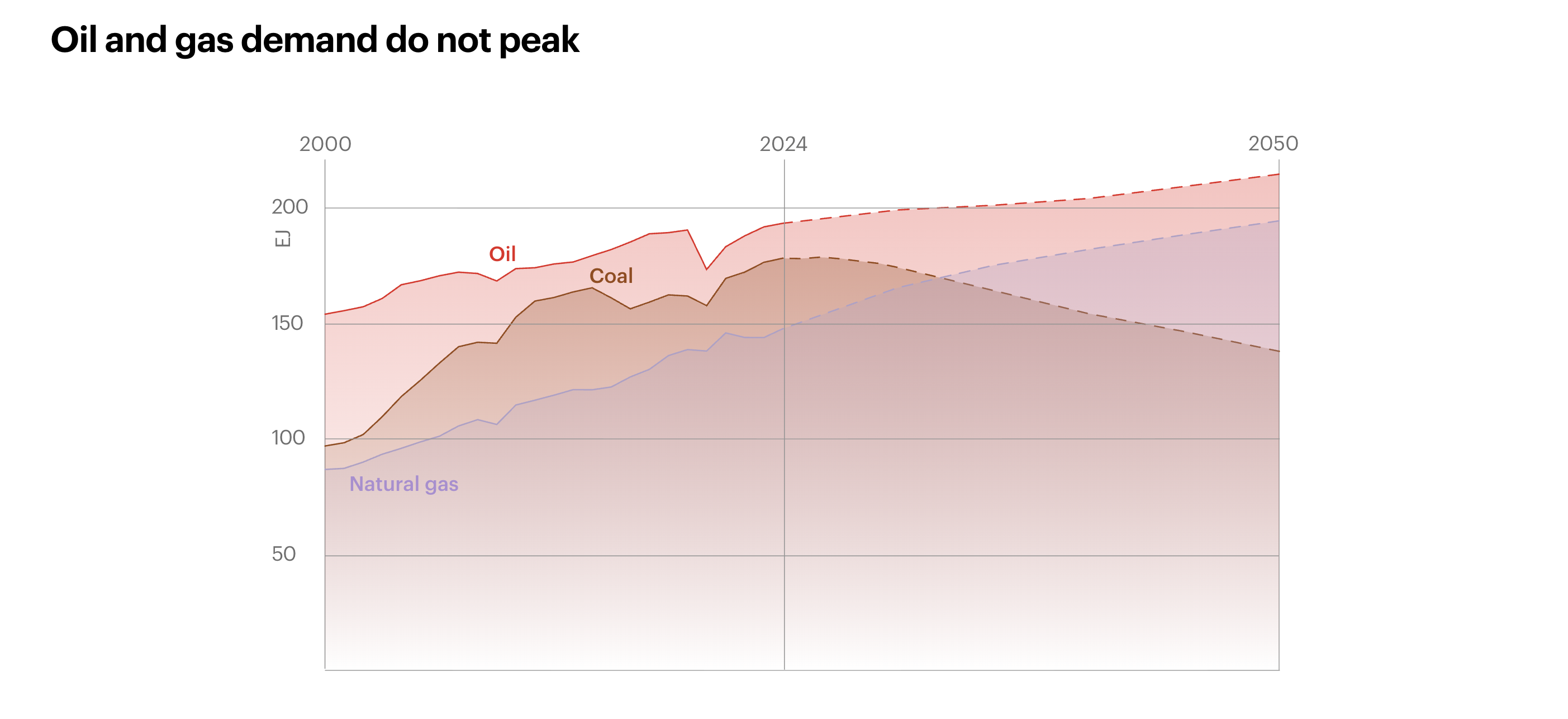 读IEA前几天发布的《世界能源展望2025》,有一张图很有意思。石油自2024年之后持续缓慢上升,并延续至2050年。天然气同样呈缓慢上升的趋势。煤炭在2030年前后进入平台期,此后缓慢下降。