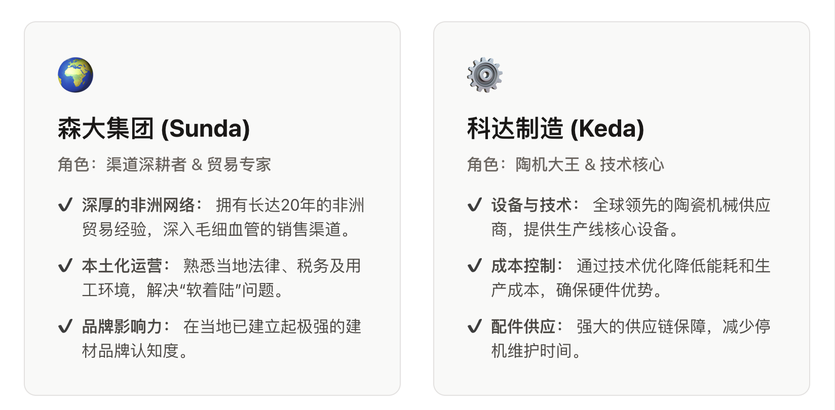 森大集团由沈延昌创立,深耕非洲二十余年,建立了深入毛细血管的分销网络超过3000个网点,是当地的隐形零售王者。面对非洲复杂的法律和回款风险,科达与森大独创了先贸易后建厂模式。第一阶段是贸易试水,森大利用现有网络引入科达产品,科达不承担库存和坏账,低风险摸清市场容量。第二阶段是合资建厂,当销量达到临界点启动合资,通常科达持股51%、森大持股49%,科达出技术设备,森大出土地渠道。第三阶段是渠道切换,工厂投产即拥有成熟网络,森大将原有进口渠道切换为销售合资厂产品。这种模式让工厂实现投产即满产,投资回收期通常仅需3到4年。