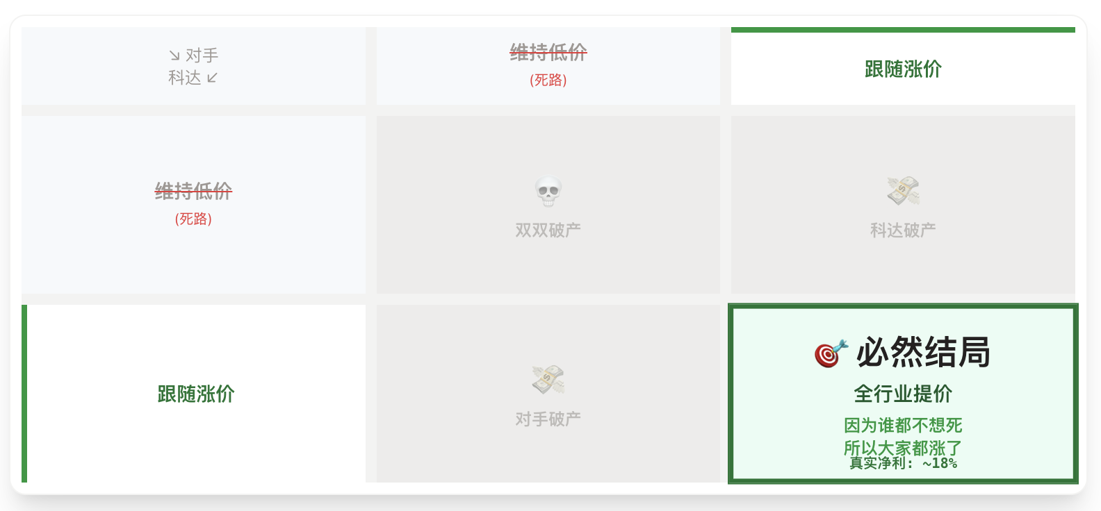 这里存在一个少数寡头下的纳什均衡(灰色的格子代表虽然理论上存在,但在财务上不可行)。