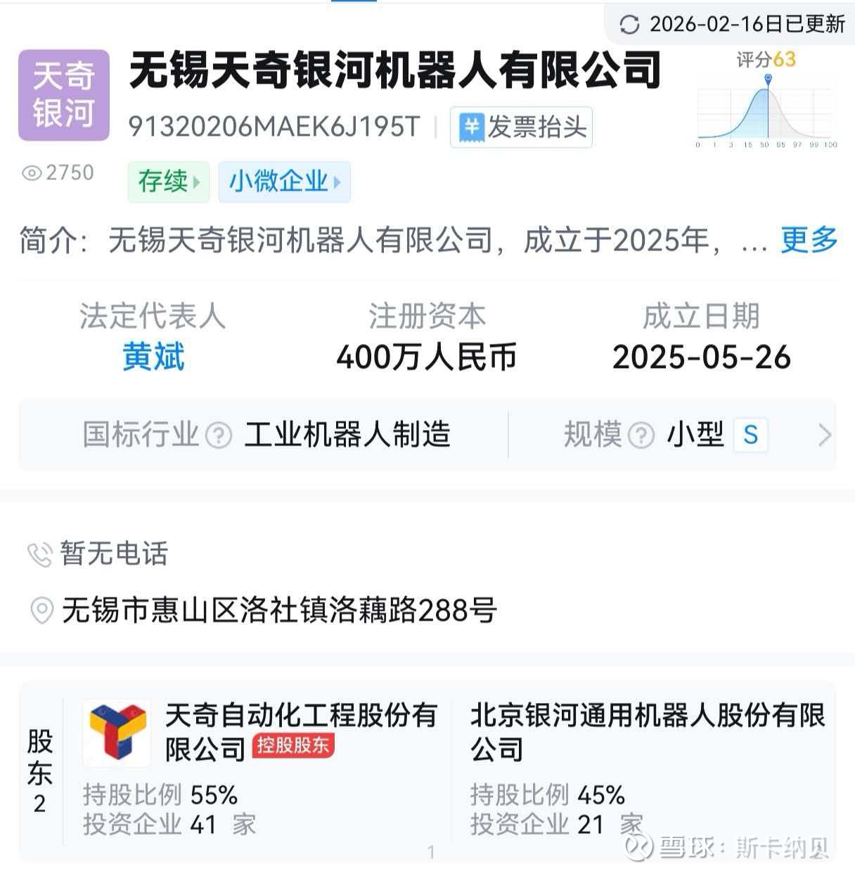 1、天奇股份分析:2025年5月成立无锡天奇银河机器人有限公司(天奇股份持股 55%,北京银河持股45%),聚焦工业具身机器人,注册资本400万。