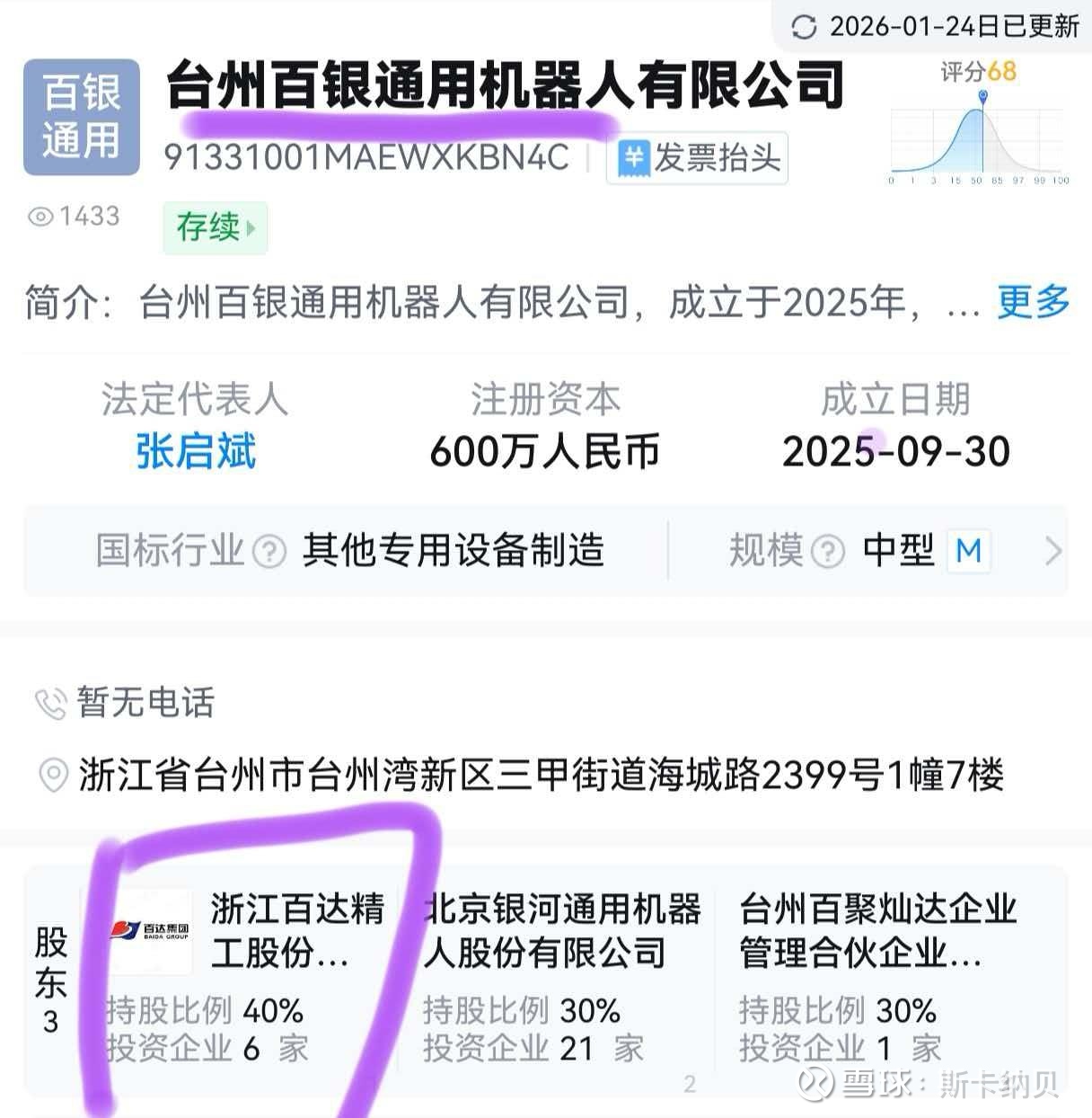 (1)2025年10月合资成立台州百银通用机器人有限公司(百达精工持股 40%,银河持股30%),注册资本600万。