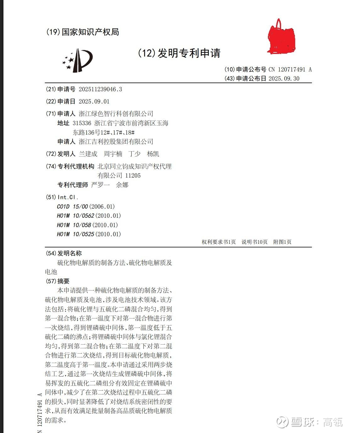 整A股没有纯固态电池生产企业,只有传统液态电池企业转型,或者固态设备公司。所以他们增量,增速从产业的角度看,不够性感,因为固态电池会替代部分传统液态电池的高端市场。所以澄星股份具备吉利产业赋能的机会,完全固态新增需求,作为核心材料,如果吉利能赋能把它打造成固态电池核心标的,未来市值空间会超级大。就算不做电池,吉利赋能产业链,成为固态核心材料供应商,也起码对标当年的液态电解液的空间,所以为什么$澄星股份(SH600078)$ 那么强势的原因在这里?同时从吉利公布的专利看:吉利选择五硫化二磷,硫化锂路线。如果吉利能产业赋能澄星股份,随便给点材料订单,作为固态硫化物电解质企业,或者固态核心材料公司,百亿市值是起步?下图是吉利10月1日公布的硫化物固态电解质专利: