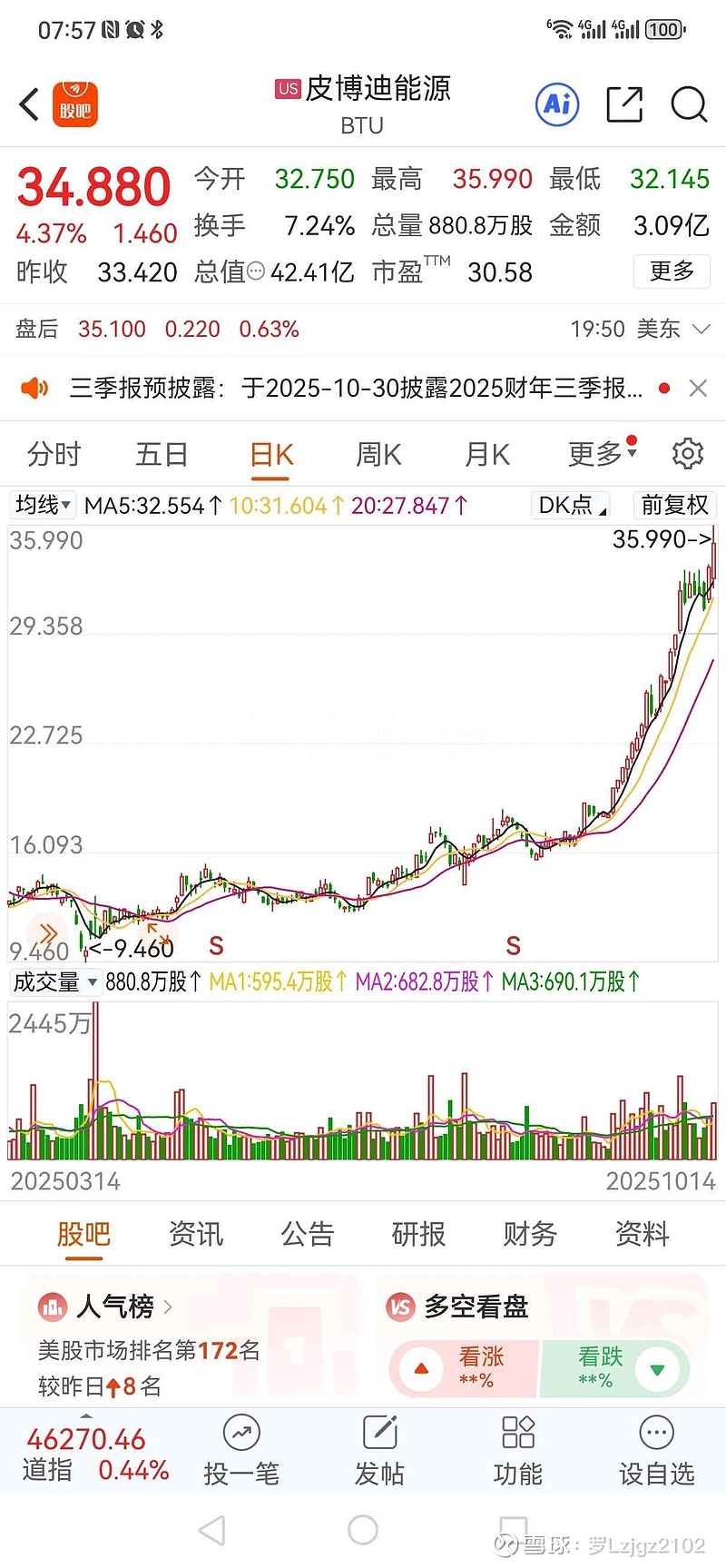美国煤炭小盘股皮博迪能源BTU,最近从低位10元左右涨到35元,气势如虹!市盈率已经去到了30倍。中国煤炭小盘股上海能源还在底部区域徘徊,和美国小盘煤炭股比,股价严重低估了。$上海能源(SH600508)$