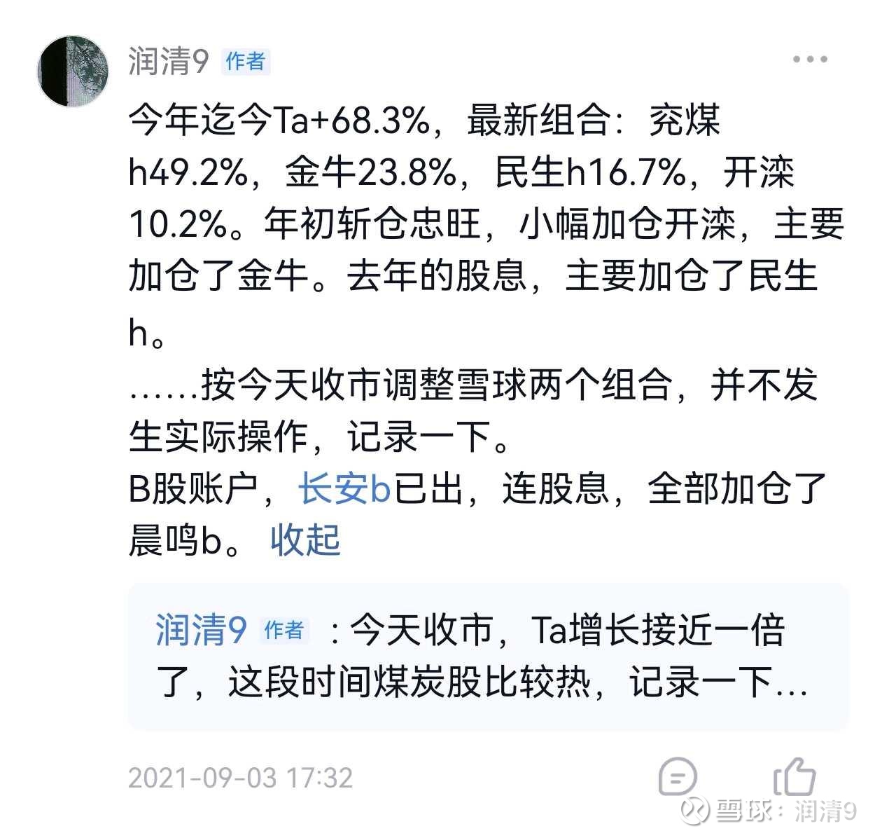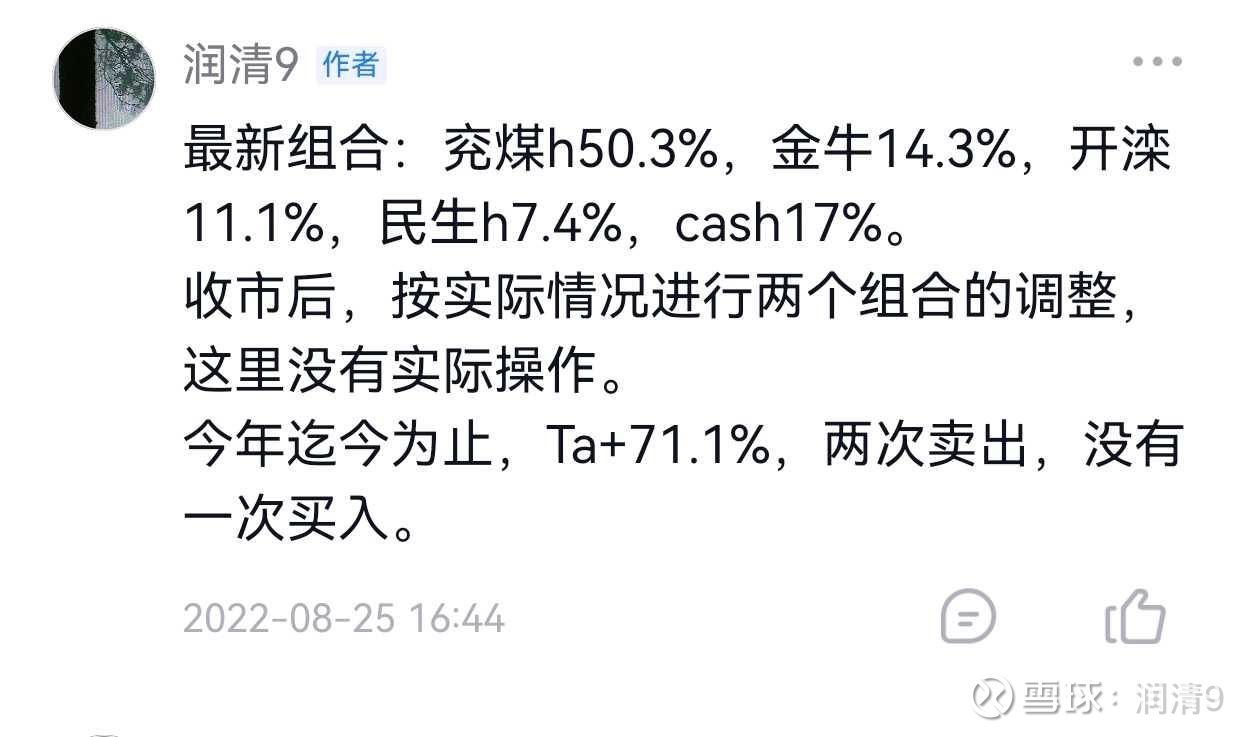 ……年底组合:兖矿h14.84+16.4%占46.8%,信达0.78-24%占13.6%,民生h2.65+7.6%占11.6%,cash28%;Ta+23.9%。