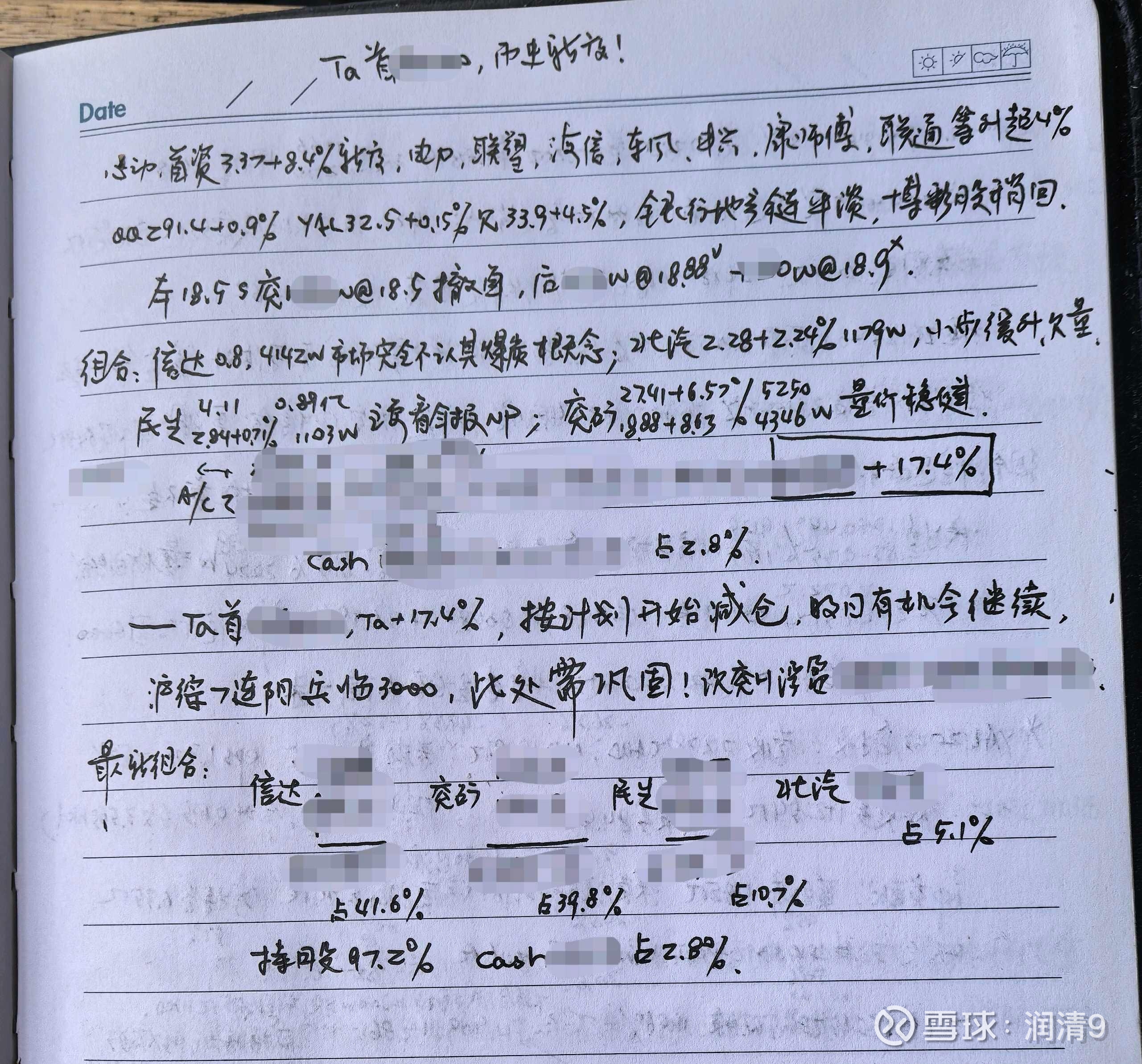 最新组合:华域55.2%,科工28.7%,民生h4.5%,洋河2.4%,cash9.2%;年内Ta+3.33%,希望努力可以实现全年15~20%。