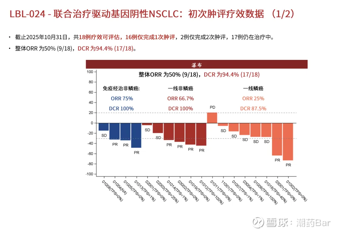 维立志博的LBL-024已经在NSCLC适应症上做出了非常惊艳的疗效,如下图所示,免疫经治的二线治疗非鳞癌ORR达到了75%,一线治疗非鳞癌达到了66.7%,已经可以给它在驱动基因阴性的非鳞癌治疗拍估值了,一线和二线都可以打入估值!