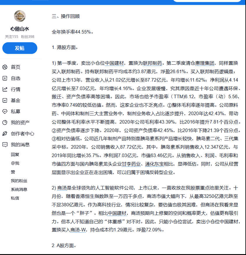 2022年较为成功的操作就是卖出一部分的中国建材和清仓惠理集团,买入联邦制药和商汤。这成为账户近两年取得超额收益的主要来源。