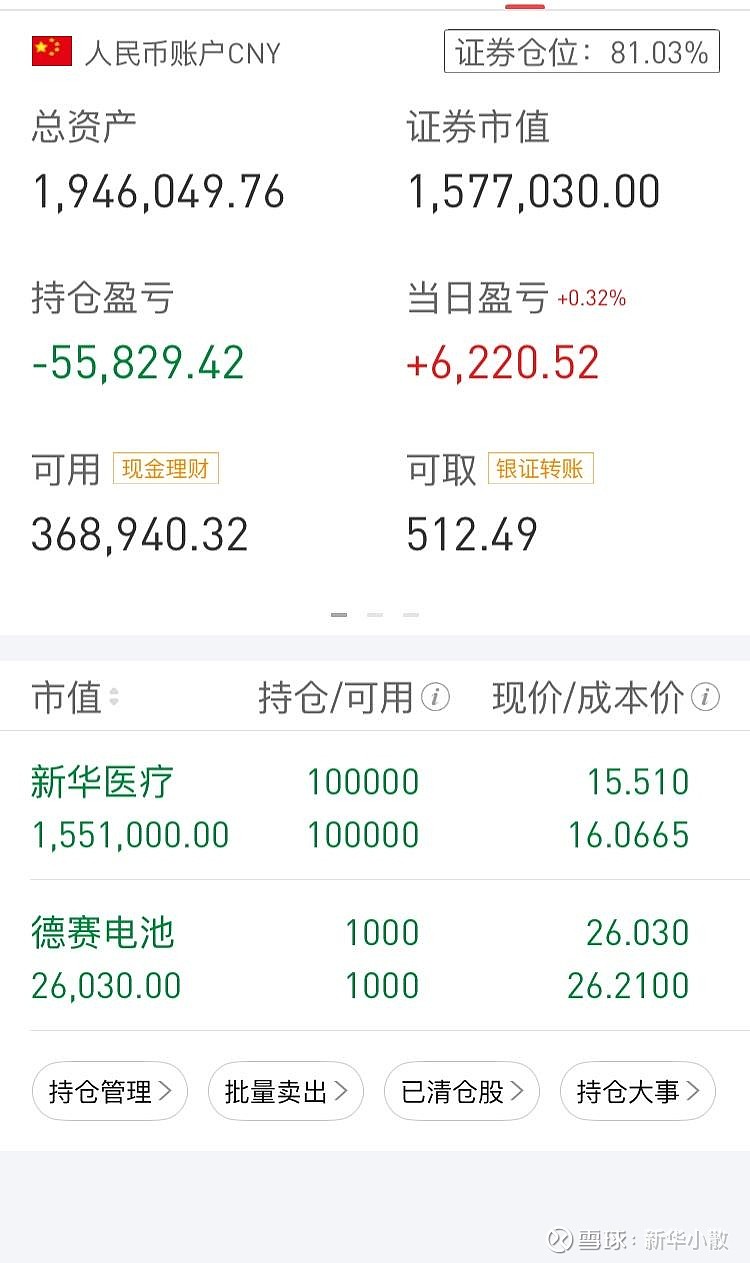 $新华医疗(SH600587)$ 早上刷到马斯克研究出干电池,赶紧减仓了德赛,还是对新华最放心,下跌就8年抗战,这次已经连续抗战2年连7个月了,还有5年多可以等待,炒股炒的心很平静了,接受了不涨和下跌是常态,天天涨的股票不敢多买也拿不住,最终也赚不了钱。有没重仓新华的一起熬下去?