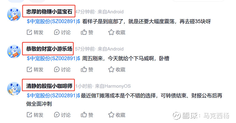 $中宠股份(SZ002891)$ 周末无事,一顿分析,感觉这个公司各项业务发展还都是比较良性得,整个行业发展也是未来几年可持续得,结果今天周一上来就给了个暴击。可苦了周五追入得人了,现在股价回到了上周四以下了,搞得不好上周五追的人可能要亏七八个点了,真TM无情啊。乖宝好一点但也没好到哪去,看来还不是中宠转债得问题,中宠得转债还有1.73亿,这周转债得事情就结束了。今天中宠这里怎么多了下图里的这种发言,这是刚注册的账户默认的名称?平常这里就那么几个人发言,今天突然来了这么几个名称一致的,这是啥意思?哎,今天比较沮丧,看好的票都表现非常差,像中宠还有$九号公司-WD(SH689009)$ ,早上随着大盘下去的,但没随着大盘上来,九号今天还创了新低,自己真的成了妥妥的反向指标了,看好啥不但是不涨,还是大跌,这到底是哪里出了问题?