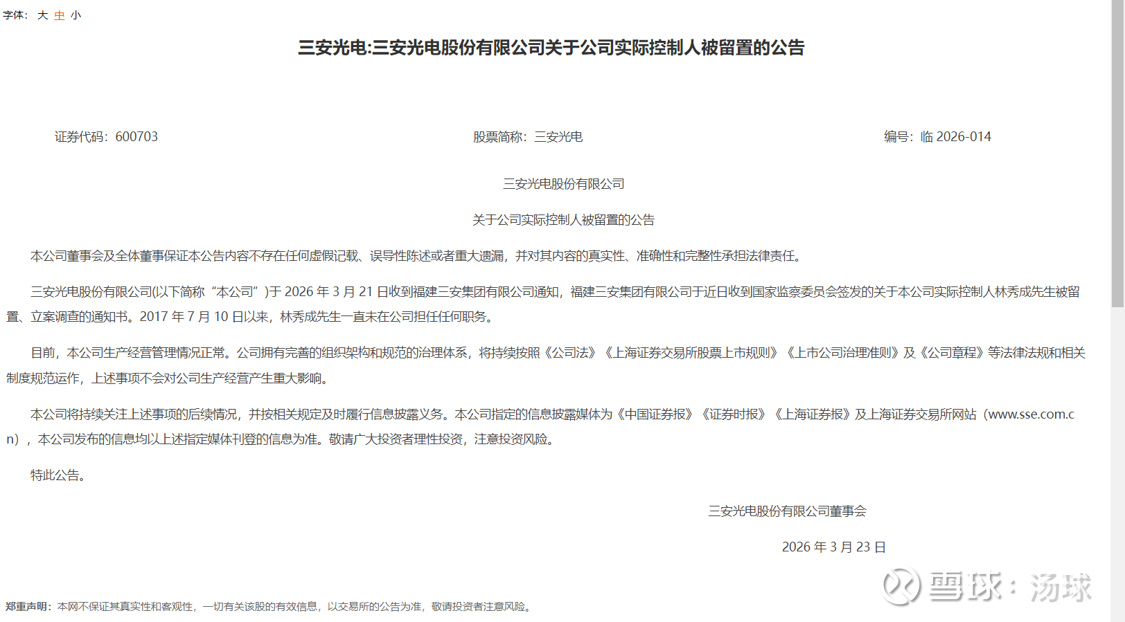 $三安光电(SH600703)$ 3月22日发公告,实控人林秀成被留置。
