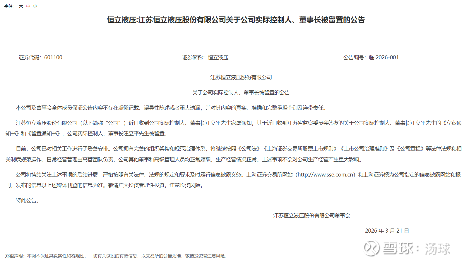 好巧不巧,$恒立液压(SH601100)$ 周五也发公告,实控人,董事长汪立平被留置。