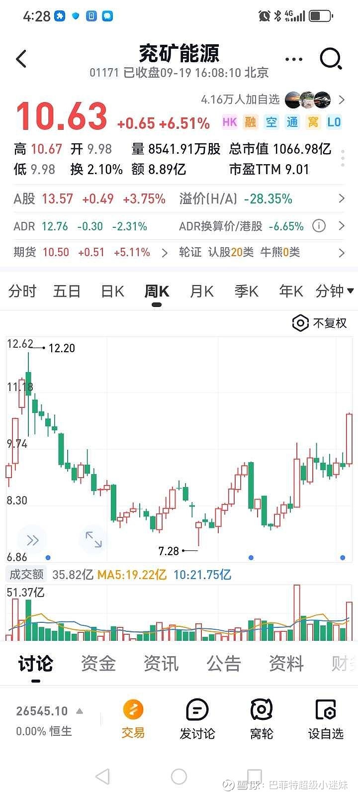 $兖矿能源(01171)$今天兖矿H股怒涨6.51%,是今年以来表现最好的一天。单吊一只兖矿,从今年2月底开始建仓,7.28也加过仓,9.28也追过高,到今天收盘,浮盈26%。如果H股涨到12港元以上,就继续买A股。不到3亿吨达产或者股息率降到4以下,不考虑卖出。