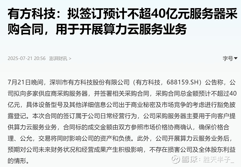 $有方科技(SH688159)$ ——签订40亿元服务器采购合同——布局云计算+算力租赁