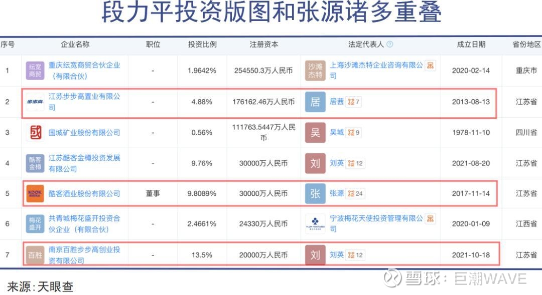 不仅如此,段永平家族更是深度参与着张源的商业投资,涉及地产、酒业、电子批发、创投等领域。比如张源旗下酷客酒业、江苏百胜电子、大千生态、利源股份等等公司中,段力平都有持股或任职。