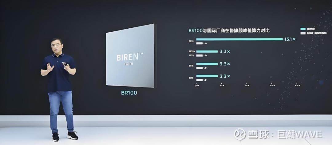壁仞宣称BR100单芯片峰值算力可达每秒千万亿次浮点运算,可比肩英伟达H100,表示算力可达到国际旗舰产品 (A100)的三倍。
