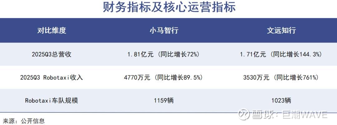 数据显示,2025年第三季度二者的Robotaxi业务收入分别是4770万、3530万,前者规模更大,而后者761%的同比增速更高;车队规模上,小马智行对外宣布,其Robotaxi运营车队规模已正式突破1159辆,而文远知行的这一数字为1023辆。