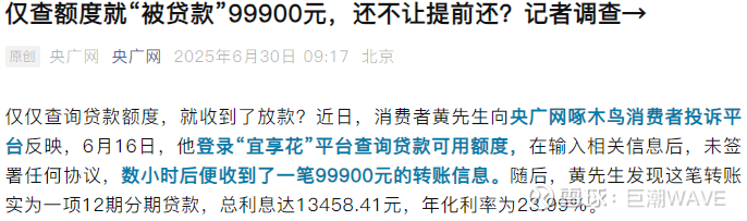 2025年6月30日,央广网就曾报道,消费者黄先生只是在宜享花APP上查询了一下自己的可贷额度,既没有签署任何借款协议,也没有进行人脸识别等身份验证环节,当晚就被强制放款99900元,年化利率高达23.99%。