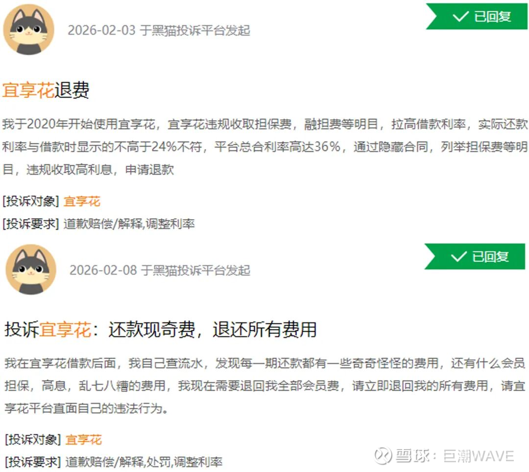 在投诉平台和各种社交媒体上,有大量对宜享花通过暗扣服务费、会员费、担保费等方式,变相提高借款人融资成本的抱怨。不少用户都在反映,宜享花的实际年化利率已经远超24%的监管上限,高达36%的综合利率也比比皆是。
