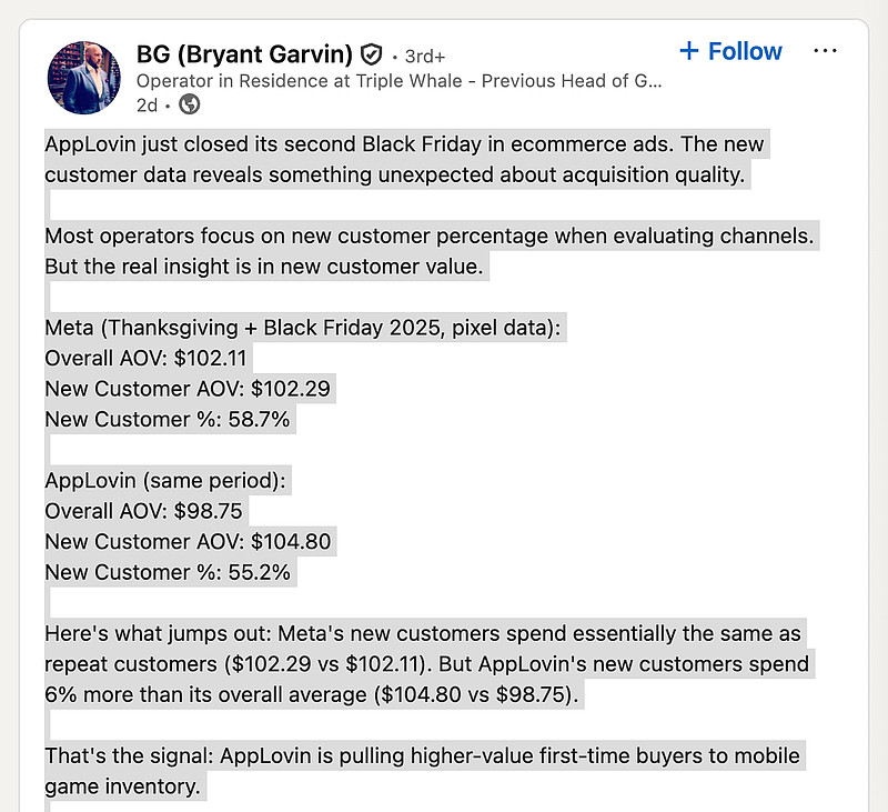 AppLovin 刚刚结束了其电商广告业务的第二个黑色星期五活动。新的客户数据揭示了一个关于用户获取质量的意外发现。
