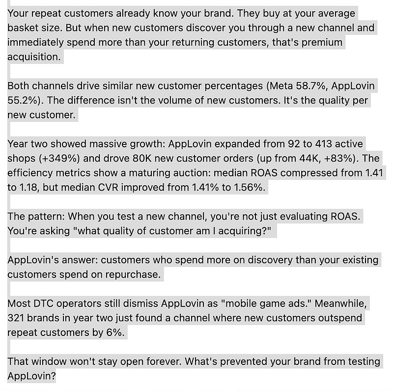 大多数直接面向消费者(DTC)品牌仍将 AppLovin 视为 "移动游戏广告平台" 而忽视。与此同时,第二年已有 321 个品牌通过该渠道发现:新客户消费额比复购客户高出 6%。