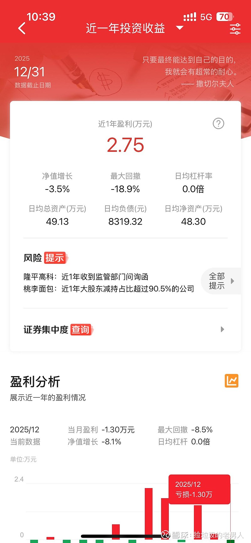 整个一年都不温不火,3月份临时一笔30多万用钱,以及11月份临时决定买个房,从融资账户和普通账户提取70多万,导致整个节奏全乱。