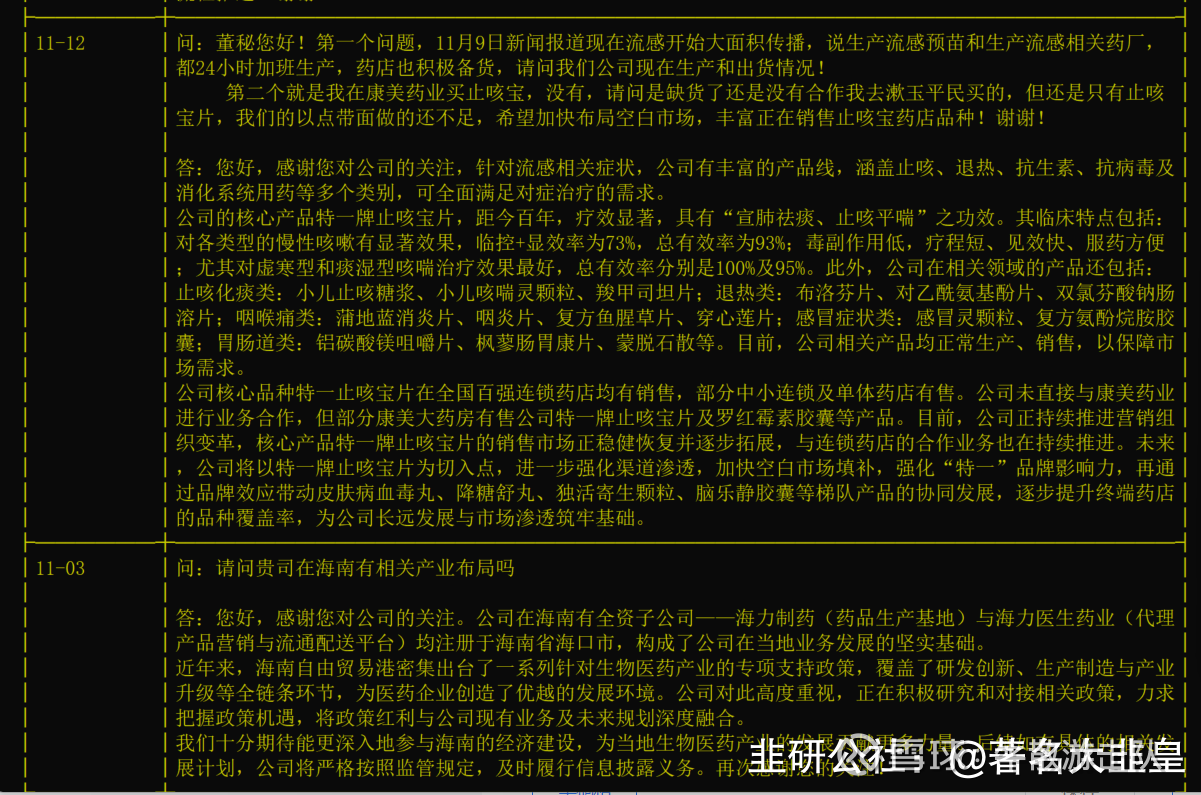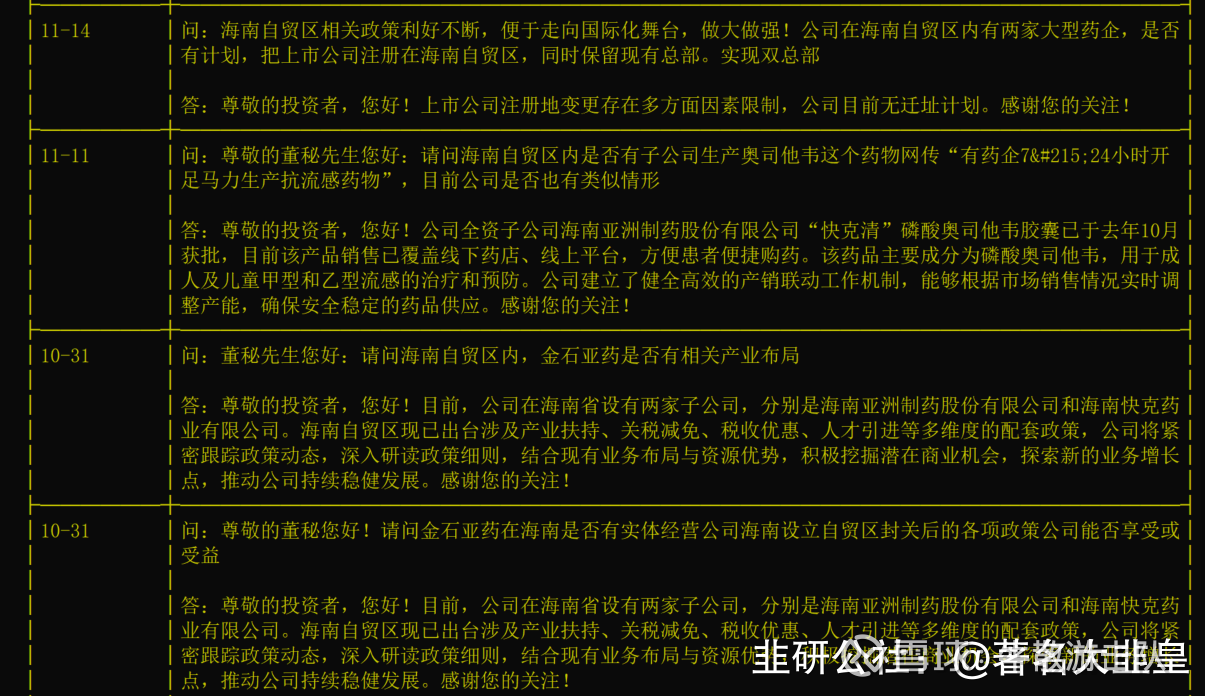 公司全资子公司海南亚洲制药生产的“快克清”磷酸奥司他韦胶囊(用于治疗和预防甲型和乙型流感)已于去年10月获批上市,目前销售已覆盖线下药店和线上平台