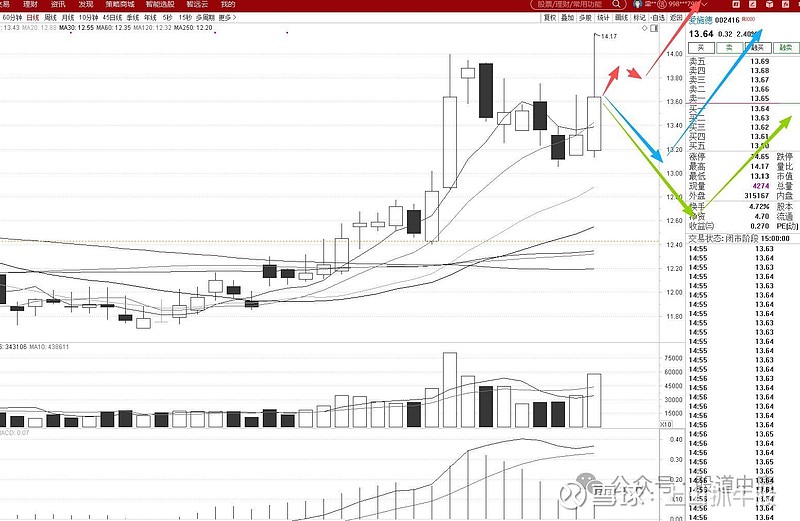 股价再次在 14 元左右的前高位置遭遇阻力,随后回落,并下探至 20 日线附近。这种走势相对较为平稳,股价在前高受阻后进行正常回调,若能在 20 日线获得有效支撑,后续仍有机会再次发起上攻。